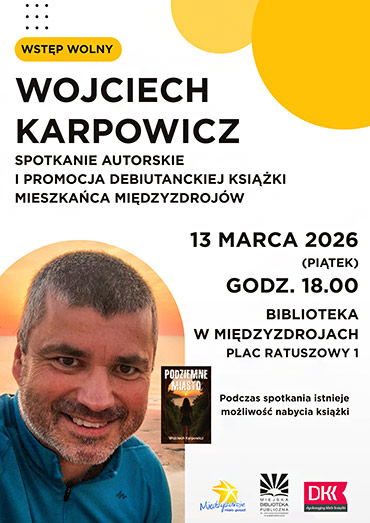 Miejska Biblioteka Publiczna w Międzyzdrojach zaprasza na spotkanie autorskie z Wojciechem Karpowiczem, które odbędzie się 13 marca 2026 r. (piątek) o godz. 18.00 w bibliotece (Plac Ratuszowy 1). Wojciech Karpowicz jest międzyzdrojaninem i autorem debiutanckiej powieści sensacyjno-przygodowej pt. „Podziemne miasto".