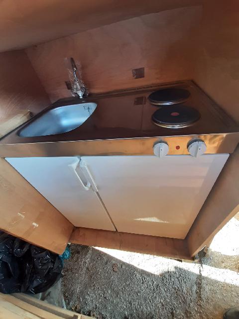 Mobilna kuchnia w bardzo dobrym stanie, z zintegrowanym zlewem i płytą grzewczą, lodówka z zamrażalnikiem i podgrzewaczem wody. Idealna do małych przestrzeni lub jako dodatkowa kuchnia. Praktyczne rozwiązanie dla osób poszukujących kompaktowego sprzętu kuchennego.