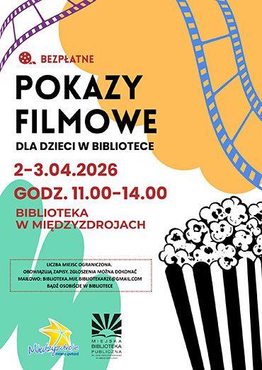 Miejska Biblioteka Publiczna w Międzyzdrojach zaprasza na bezpłatne pokazy filmowe dla dzieci, które odbędą się 2-3 kwietnia 2026 w bibliotece (Plac Ratuszowy 1) w godz. 11.00-14.00.
