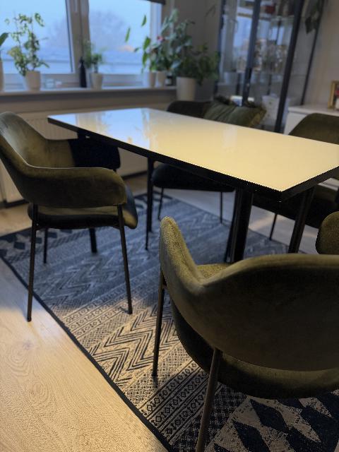 Blat z płyty meblowej lakierowanej na czarny połysk. Na wierzch naklejone białe szkło. Dzięki regulowanym nogom można dostosować wysokość do krzeseł. Stan widoczny na zdjęciach.