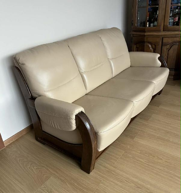 Sprzedam w bardzo dobrym stanie kanapę trzyosobową firmy KLER z tapicerką naturalnej skóry bydlęcej w kolorze beżowym, uzupełnieniem kanapy mogą być jeden lub dwa fotele z tej samej kolekcji . Cena do uzgodnienia.